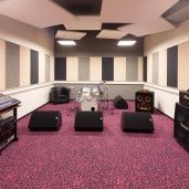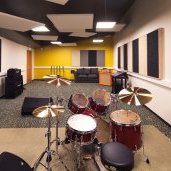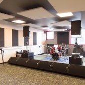 Au sud, les bureaux et les studios de répétitions. L’équipement comprend 5 studios de répétitions, dont un grand studio de 70 m² avec régie principale reliée à tous les studios, une salle MAO (musique assistée par ordinateur) et six bureaux.
